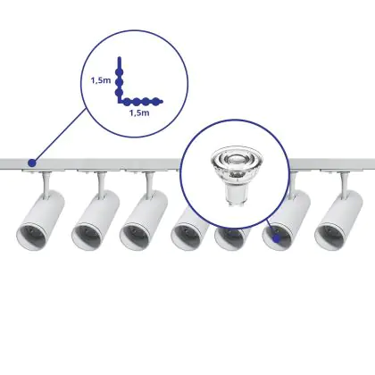 Complete Set 1-Phase Rail L 1,5 x 1,5 Meter White | incl. 7x Spot + GU10 2700K 3W Dimmable + End Cap, Power Connector and L -Connector