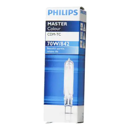 CDM-TC is a compact high pressure ceramic burner discharge lamp with a bright light and a very stable luminous flux. Philips CDM-TC 70W 842 G8.5 have a G8.5 base type, which allows them to replace your old halogen lamps without changing your installation. The average lifespan of the Philips CDM-TC 70W 842 G8.5 is 12000 hours, which corresponds to approximately 3 years of use.